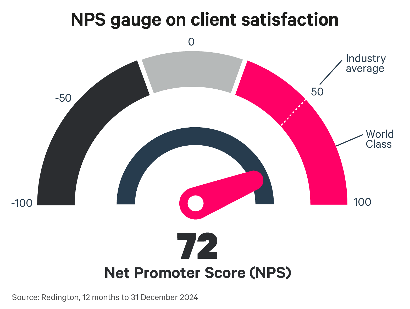 As ever, we recognise that our success relies on the robustness of client relationships, which are founded on empowering them to make informed decisions in a complex and constantly changing world. We aim to establish strong connections with our clients and provide them with the information they require through technology-enabled and easily accessible means. We measure the strength of our relationships with clients through a Net Promoter Score (NPS) metric, which remains strong compared to international benchmarks.