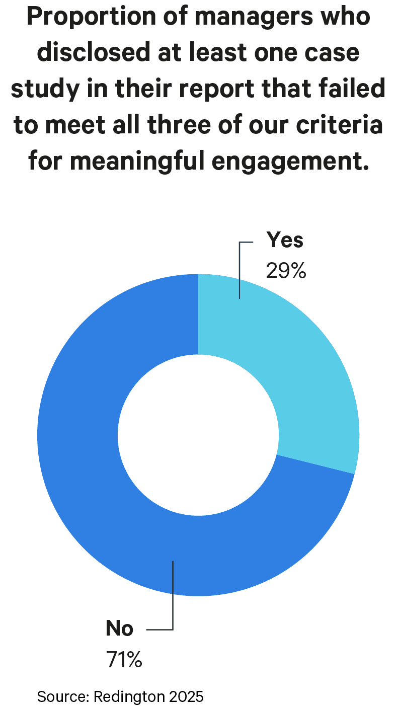 Following on from our work last year to assess case study materiality within reports, we looked to identify managers falling behind the pack. We did this by assessing the proportion of managers who disclosed at least one case study in their report that failed to meet all three of our criteria for meaningful engagement. These criteria are: proactivity, engagement on substantive issues (not just disclosure or voting) and engagement aiming to deliver a material outcome. As shown, the results were eye opening, with 29% of managers disclosing at least one case study that did not meet any of these criteria. Given that case studies represent a cherry-picked small proportion of the overall activity, this failure is of particular concern.