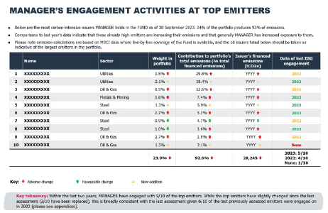 As well as highlighting the engagement coverage of key investment exposures (assessed according to several characteristics – the listing of the top 10 exposures in terms of financed emissions, as shown, is just one of these), this revealed gaps in engagement activity.