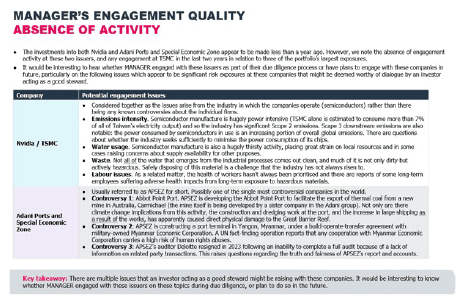Alongside this detailed quality assessment, we highlighted particular investments of concern as well as the need for engagement with these companies. This analysis provided tools for client understanding and specific questions that might be asked of each manager.