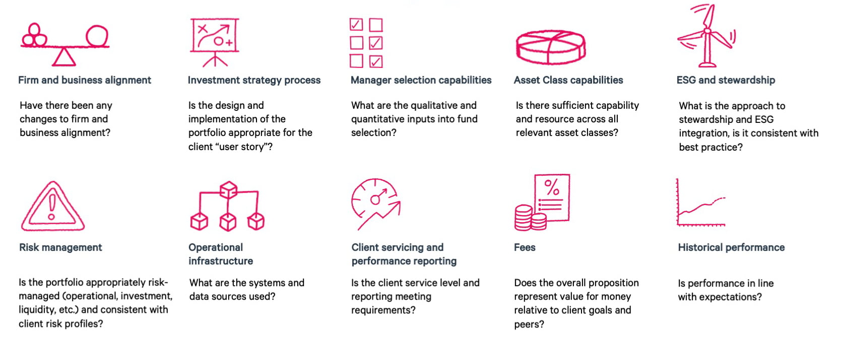 Asking the right questionsOutsourcing portfolio management does not absolve you of the responsibility of ensuring that investment decisions are made in the best interests of the individual underlying client. However, the wealth businesses that appoint DFMs often do so in order to focus their time and resources on clients. In these situations, simple frameworks and guidelines to assess the DFMs are valuable – perhaps essential.