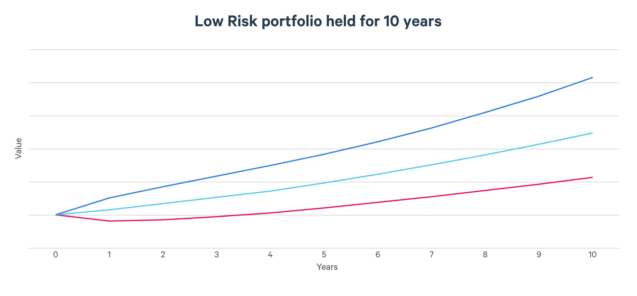 CLIENT 2This client presents as low capacity for risk with a four-year horizon. Then they leave the money with you for 10 years. The issue here is that the client has missed out on the potential for substantial upside. Albeit, in a bad scenario, they would still be better off in the lower risk portfolio.