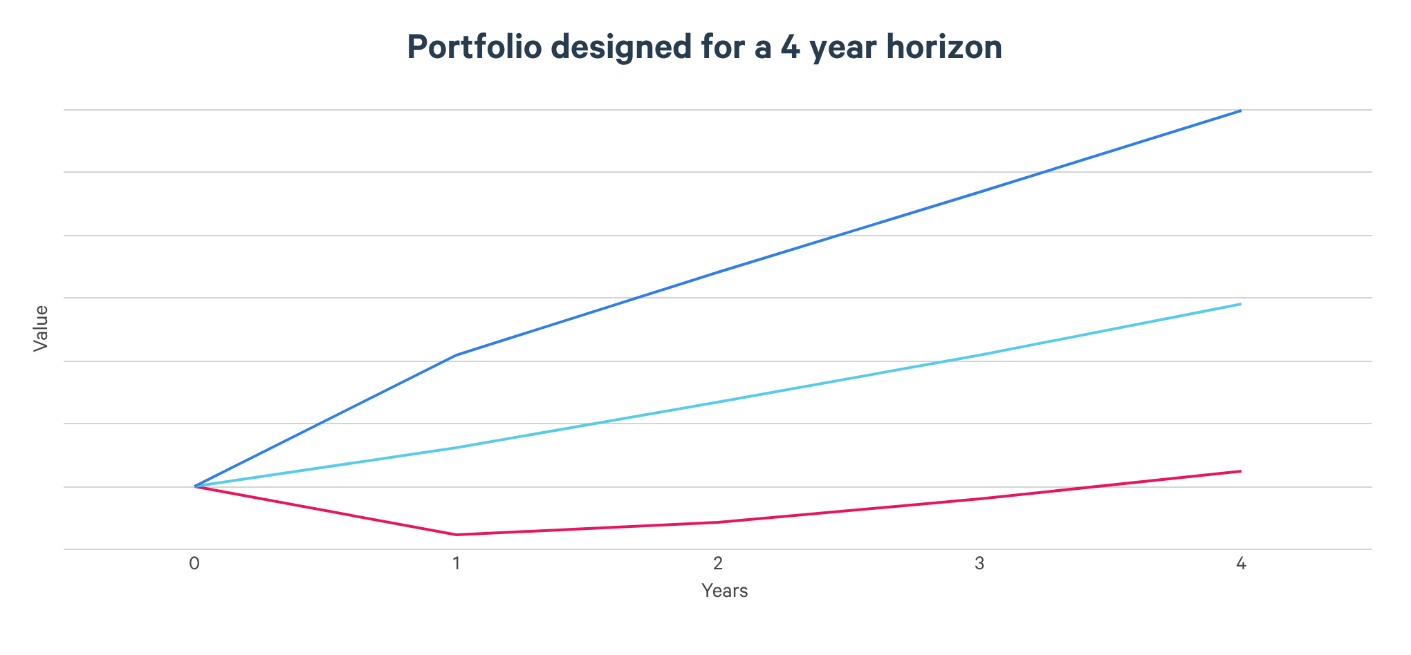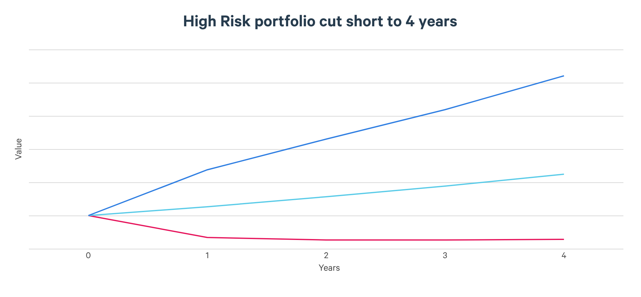 CLIENT 1This client presents as high capacity for risk with a 10+ year horizon. Then they decide they want to sell their assets after four years with no notice. The issue here is that after four years, in a bad market environment (red line), the portfolio could have lost more than it would have done in a portfolio designed for a four-year horizon. The central case and upside, on the other hand, would have delivered a better outcome though.